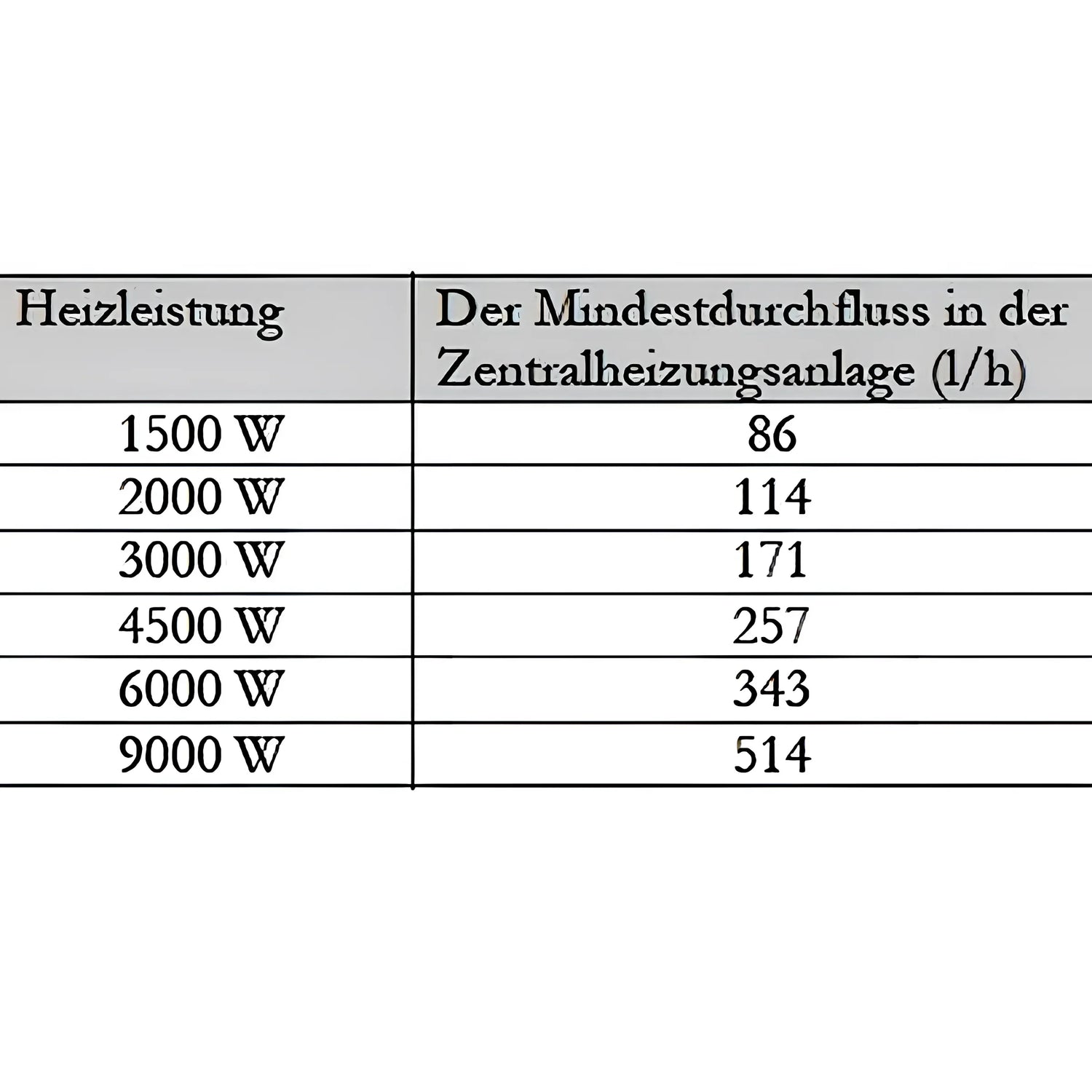 Průtokový ohřívač vody pro systémy ústředního topení má přesné možnosti připojení: Přípojka přívodu a zpátečky měří 1 1/4" IG, zatímco připojení topného tělesa je nastaveno na 1 1/2" IG. Dosahuje maximální přípustné provozní teploty 90 °C a bezpečně pracuje až do provozního tlaku 10 barů.