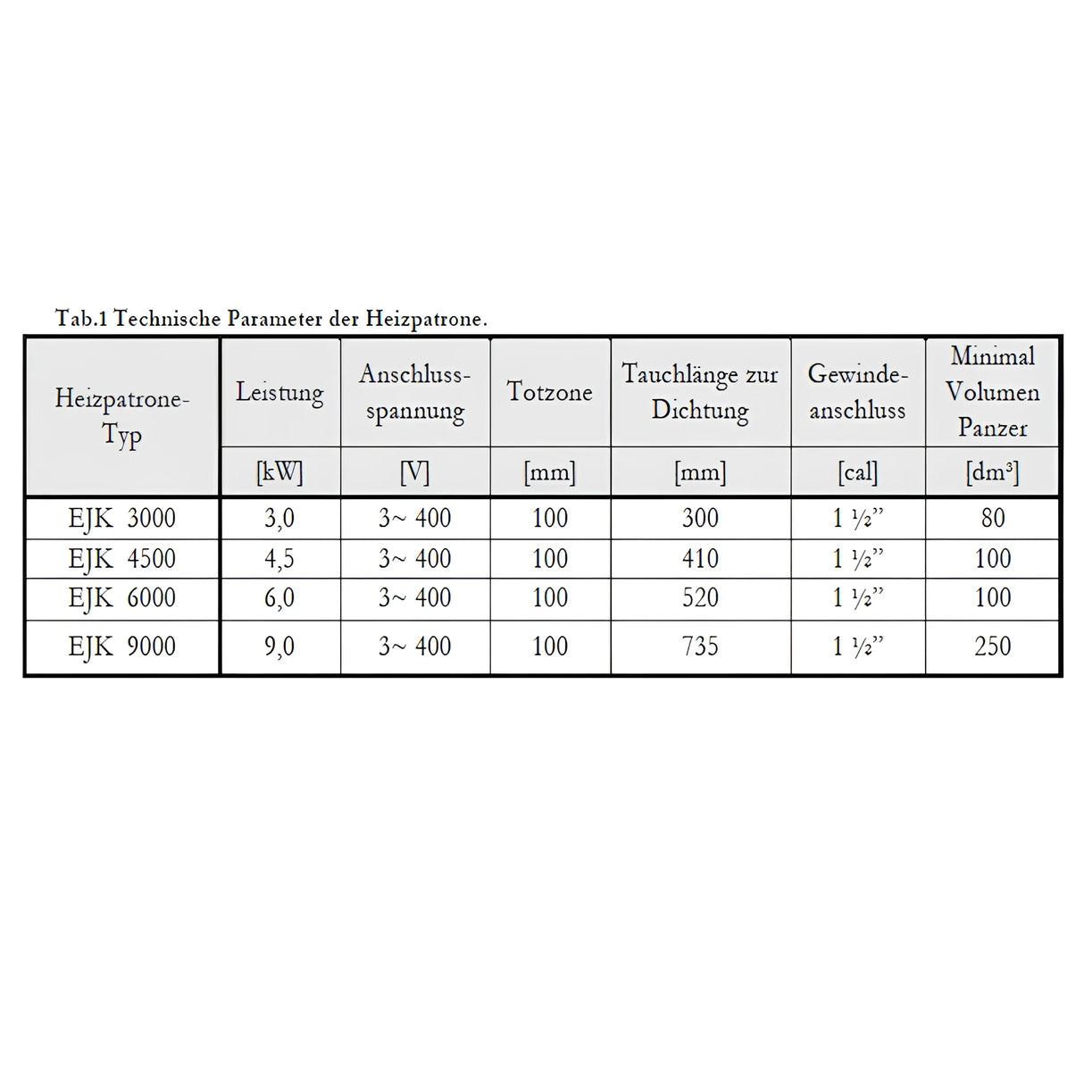 The heating cartridge of the complete package is available in different power classes, specifically designed for 1.5 kW, 2.0 kW, 3.0 kW at 230 V and 4.5 kW, 6.0 kW, and 9.0 kW at 400 V. These variants allow optimal adaptation to the individual energy requirements of the heating system.