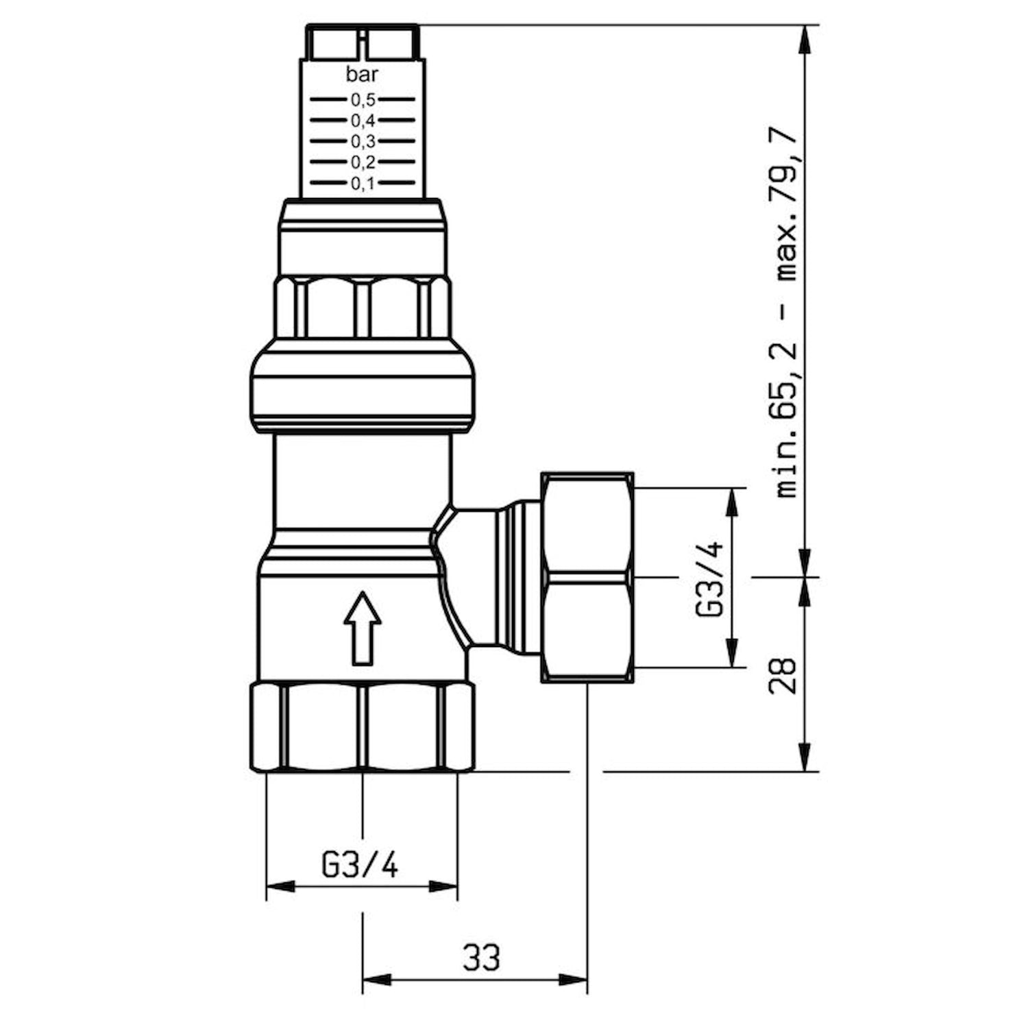 Rango de temperatura de funcionamiento: máx. 95 °C (hasta 120 °C por un breve periodo). Presión de funcionamiento: máx. 6 bar. Presión diferencial regulable de forma continua: 0,1/0,5 bar. Material de la carcasa: latón. Conexiones: Entrada con rosca interior G¾, salida con conexión roscada de sellado plano con tuerca de unión G¾.