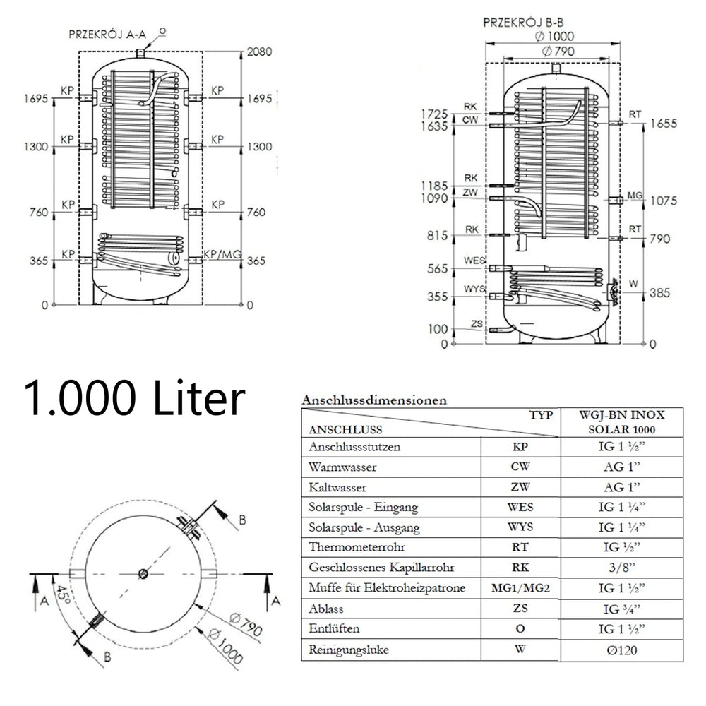 Il WGJ-BN INOX SOLAR è un serbatoio di accumulo combinato per il riscaldamento e l'acqua calda sanitaria con serpentina di riscaldamento in acciaio inox integrata come scambiatore di calore. È progettato per l'integrazione in impianti di riscaldamento centralizzati con caldaie, pompe di calore o per l'utilizzo del calore solare e consente sia l'accumulo di energia termica che il riscaldamento continuo di acqua potabile.