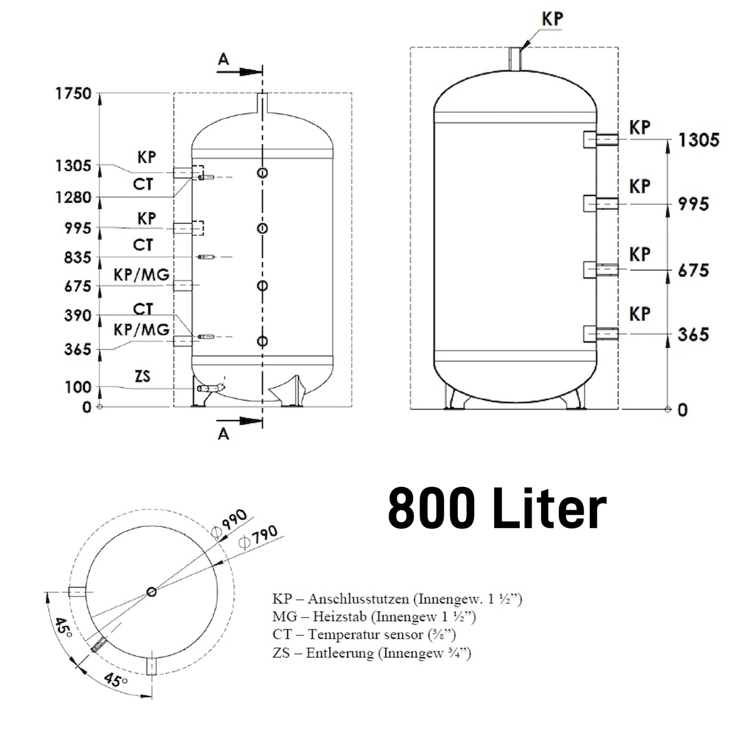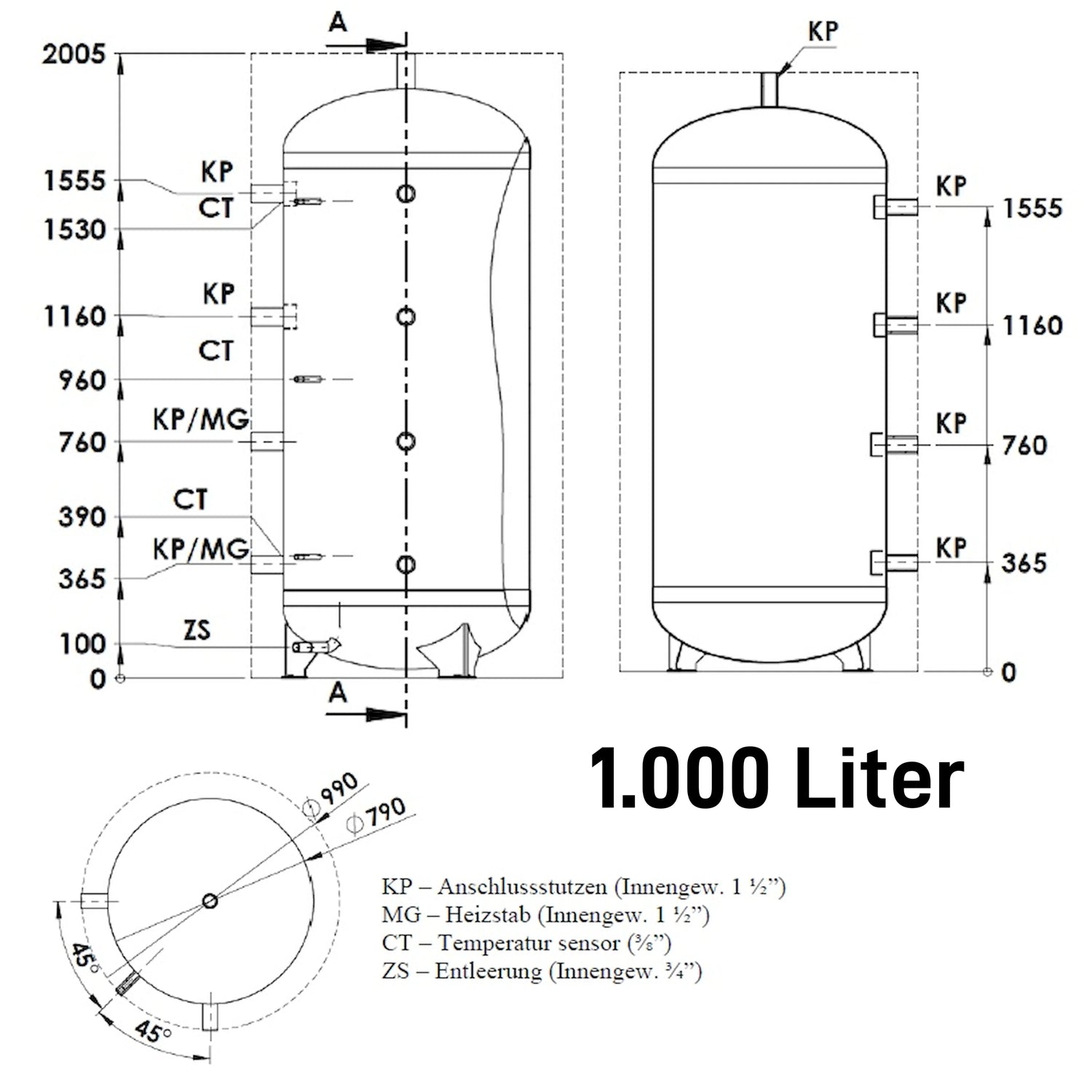 Savienojuma izmēri: Savienojuma detaļa (KP) iekšējā vītne 1½", sildelementa savienojums (MG) iekšējā vītne 1½", temperatūras sensora savienojums (CT) 3/8", Notekas (ZS) iekšējā vītne 3/4".