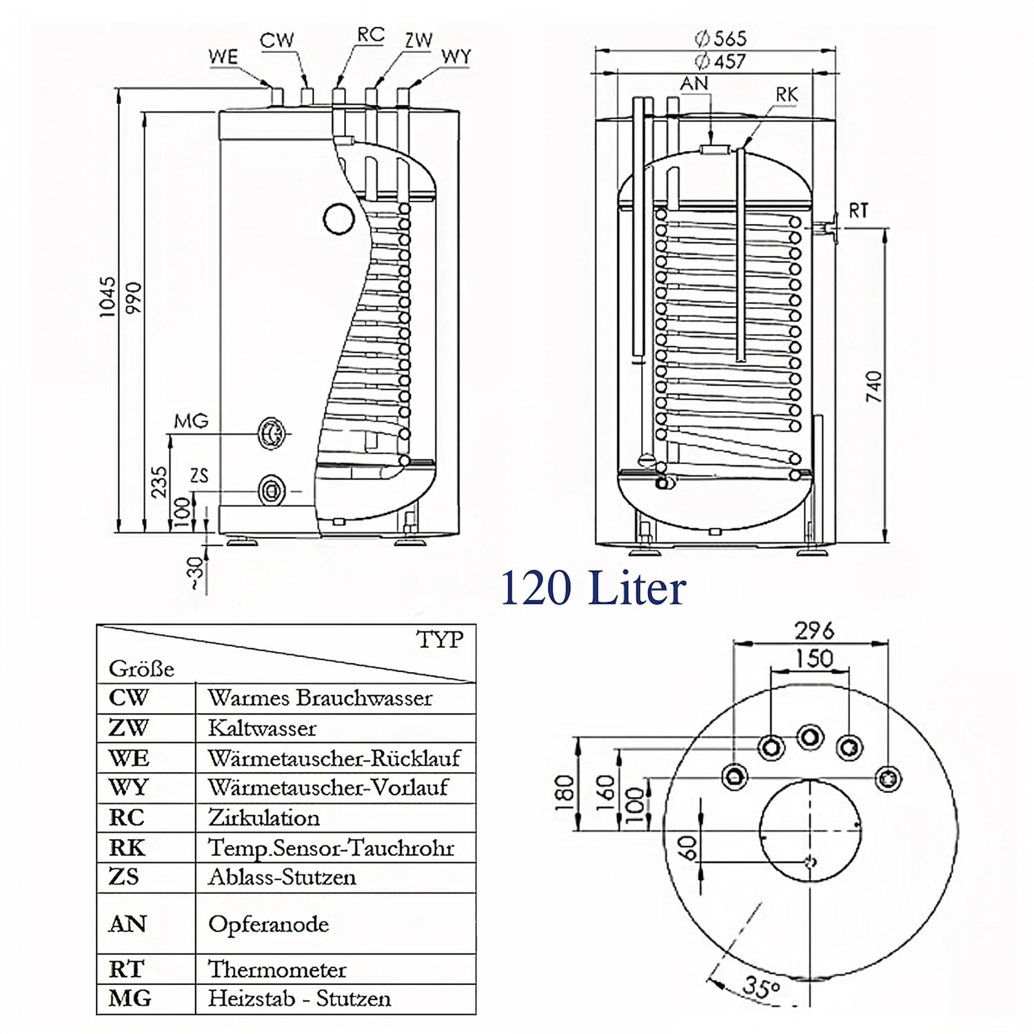 Visoko učinkovit toplotni izmenjevalec 120-litrskega bojlerja ogreva sanitarno vodo v notranjosti z uporabo toplotne energije iz termičnega sončni sistem ali iz kotla.